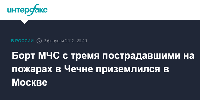 Москва. 2 февраля. ИНТЕРФАКС - Самолет МЧС России доставил в Москву троих пострадавших при пожарах в Чечне, сообщили "Интерфаксу" в субботу в управлении информацией ведомства.