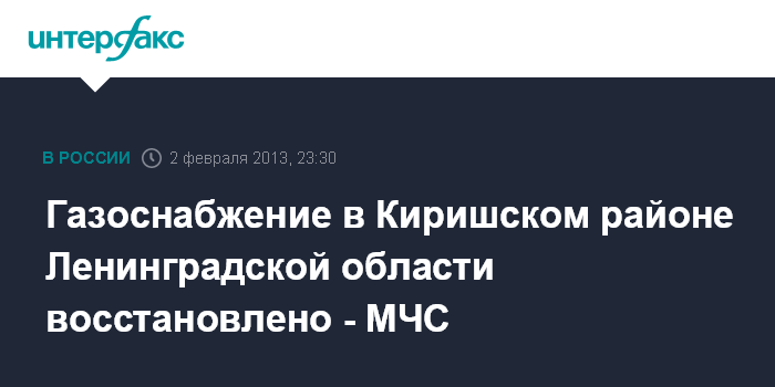 Москва. 2 февраля. ИНТЕРФАКС - Газоснабжение в Киришском районе Ленинградской области восстановлено в полном объеме в субботу вечером, сообщает НЦУКС МЧС России.
