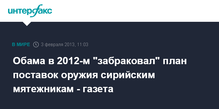 Вашингтон. 3 февраля. INTERFAX.RU - Белый дом в 2012 году отверг план, предусматривавший поставку оружия сирийским мятежникам, пишет "Нью-Йорк таймс" со ссылкой на источники в администрации президента Барака Обамы.