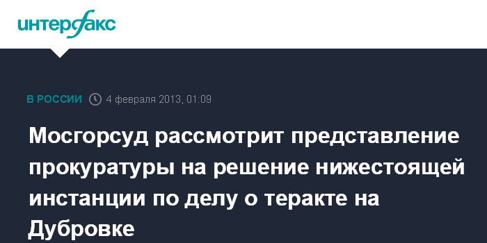 Москва. 4 февраля. ИНТЕРФАКС - Мосгорсуд в понедельник рассмотрит представление прокуратуры на решение нижестоящей инстанции, удовлетворившей жалобу потерпевших и родственников погибших во время спецоперации по освобождению заложников, захваченных в театральном центре на Дубровке в 2002 году.