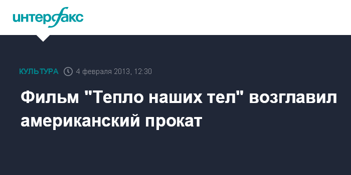 Москва. 4 февраля. INTERFAX.RU – Фильм 'Warm bodies' (в российском прокате "Тепло наших тел") возглавил американский бокс-офис по итогам уик-энда 1-3 февраля. С учетом ночных показов четверга романтическая история о зомби-апокалипсисе собрала в североамериканских кинотеатрах около $20 млн.