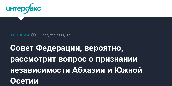 Совет Федерации, вероятно, рассмотрит вопрос о признании независимости Абхазии и Южной Осетии