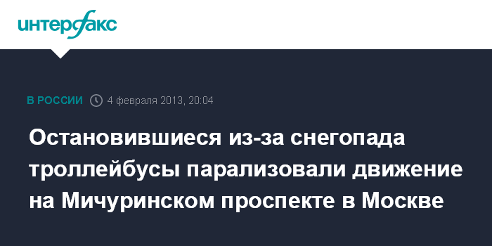 Москва. 4 февраля. INTERFX.RU - Несколько десятков троллейбусов, которые не могут продолжать движение из-за налипания мокрого снега на провода, практически полностью парализовали движение на пересечении улицы Дружбы с Ломоносовским проспектом в сторону Мичуринского проспекта на юго-западе Москвы.