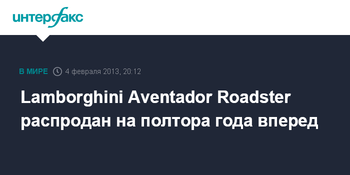 Москва. 4 февраля. INTERFAX.RU – Количество заказанных экземпляров Lamborghini Aventador Roadster, представленного публике всего три месяца назад, уже достигло критической точки. Как сообщил в понедельник журнал Auto Motor und Sport, несмотря на то, что официальные продажи еще не начались, на сегодняшний день автопроизводитель уже не принимает заказы со сроком поставки раньше лета 2014 года.