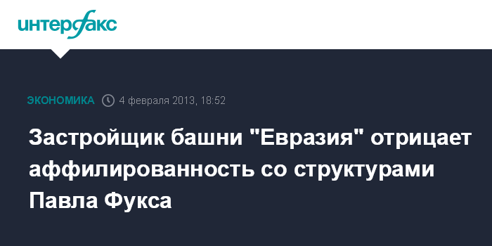 Москва. 4 февраля. INTERFAX.RU - Компания ЗАО "Техинвест", являющаяся застройщиком башни "Евразия", заявляет, что в настоящее время в составе акционеров и инвесторов компании нет структур, аффилированных с Павлом Фуксом.