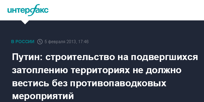 "Прошу местные власти строго следить, чтобы на территориях, подвергшихся затоплению, без проведения специальных противопаводковых мероприятий больше не велось никакого нового капитального строительства. Уже хватит этих трагедий", - заявил Путин на совещании по вопросам, связанным с ликвидацией последствий наводнения в Крымске.