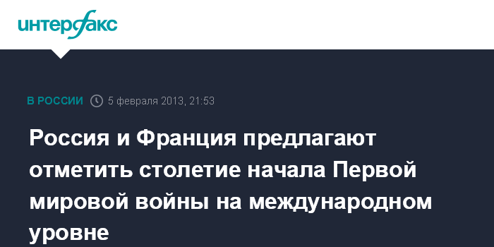 Париж. 5 февраля. INTERFAX.RU - Россия и Франция предлагают вывести на международный уровень мероприятия по случаю столетия со времени начала Первой мировой войны.