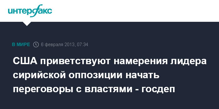 Вашингтон. 6 февраля. ИНТЕРФАКС - Соединенные Штаты поддерживают намерение руководителя Национального комитета сирийских революционных и оппозиционных сил (НКСРОС) Моаза аль-Хатиба начать переговоры с сирийскими властями в соответствии с женевскими договоренностями по Сирии, заявила официальный представитель госдепартамента США Виктория Нуланд.
