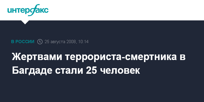 Тегеран. 25 августа. INTERFAX.RU - В результате взрыва, совершенного террористом-самоубийцей в районе Абу-Грейб на западе иракской столицы Багдада, погибли по меньшей мере 25 и ранены 30 человек, передает иранский англоязычный телеканал "Пресс-ТВ".