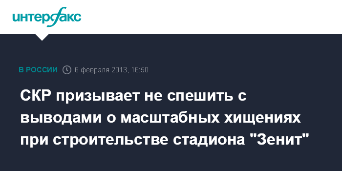 Москва. 6 февраля. INTERFAX.RU - Сведения о многомиллионных хищениях при строительстве стадиона "Зенит" в Санкт-Петербурге преждевременны, заявил официальный представитель Следственного комитета РФ Владимир Маркин.