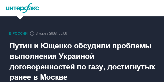 Путин и Ющенко обсудили проблемы выполнения Украиной договоренностей по газу, достигнутых ранее в Москве