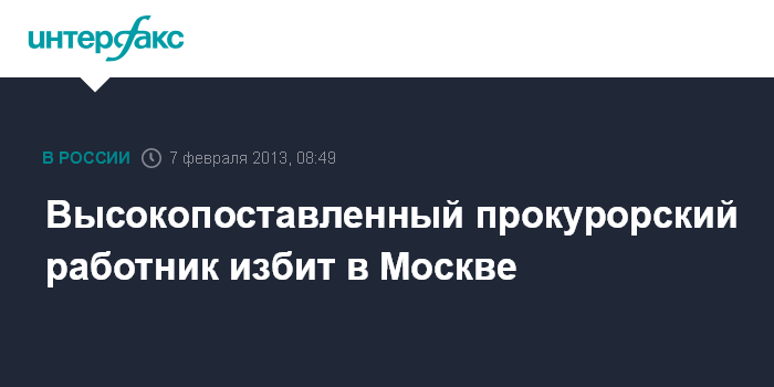 Москва. 7 февраля. INTERFAX.RU - Неизвестный избил до потери сознания первого заместителя прокурора по Северо-Западному административному округу Москвы, сообщил "Интерфаксу" источник в правоохранительных органах в четверг.