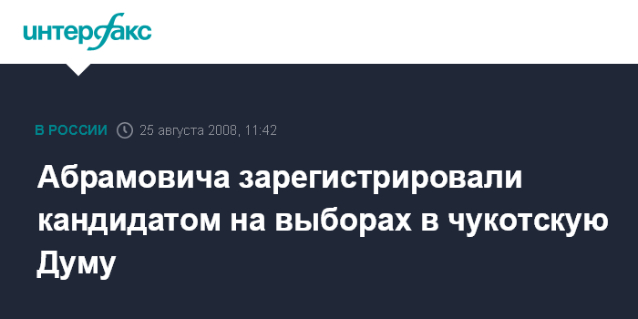 Хабаровск. 25 августа. INTERFAX.RU - Экс-губернатор Чукотского автономного округа (ЧАО) Роман Абрамович зарегистрирован избирательной комиссией региона в качестве кандидата на выборах в местную Думу.