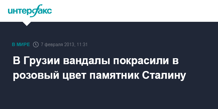 Тбилиси. 7 февраля. INTERFAX.RU - В грузинском селе Акура (регион Кахетия) неизвестные в ночь на четверг сняли с постамента бюст Сталина и облили его розовой краской, сообщают грузинские СМИ. Местные жители в беседе с журналистами назвали эти действия "вандализмом". По их мнению, никто из проживающих в селе не стал бы портить памятник.