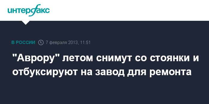 Санкт-Петербург. 7 февраля. INTERFAX.RU - "Северная верфь" проведет заводской ремонт крейсера "Аврора", работы начнутся летом 2013 г., сообщил "Интерфаксу" в четверг советник губернатора Петербурга Игорь Курдин.