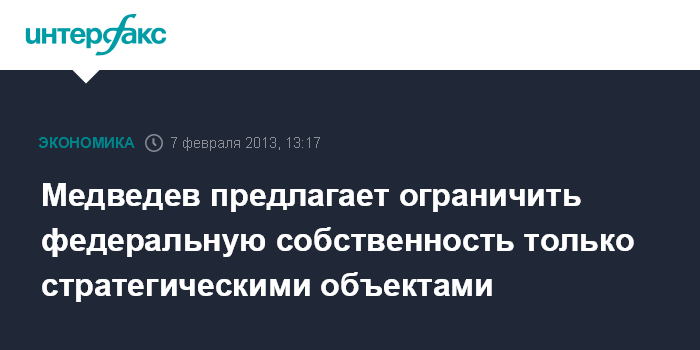 Москва. 7 февраля. INTERFAX.RU - В федеральной собственности должны оставаться только те объекты, которые необходимы для обеспечения стратегических задач государства, заявил премьер-министр РФ Дмитрий Медведев.