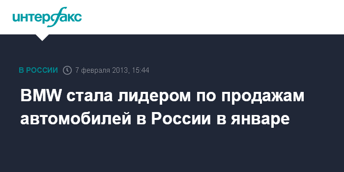 7 февраля. INTERFAX.RU - В январе 2013 г. германский автопроизводитель Bayerische Motoren Werke (BMW), который часть автомобилей для российского рынка выпускает на мощностях в Калининградской области, реализовал в России 2,171 тыс. автомобилей, сообщил "Интерфаксу" официальный представитель российского подразделения BMW Василий Мельников.