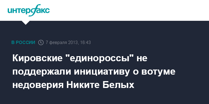 Киров. 7 февраля. INTERFAX.RU - Президиум политсовета кировского регионального отделения "Единой России" в четверг не поддержал инициативу своих коллег по партии, заявивших о необходимости проведения внеочередного заседания областного Законодательного собрания по вопросу о выражении недоверия губернатору Никите Белых, сообщил корреспондент "Интерфакса".