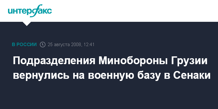 Москва. 25 августа. INTERFAX.RU - Подразделения грузинской регулярной армии минувшей ночью вернулись на место своей постоянной дислокации - на военную базу в Сенаки, заявили "Интерфаксу" в Минобороны Грузии. По словам собеседника агентства, российские войска вывезли с базы находившееся там оружие и технику, повреждена взлетно-посадочная полоса.