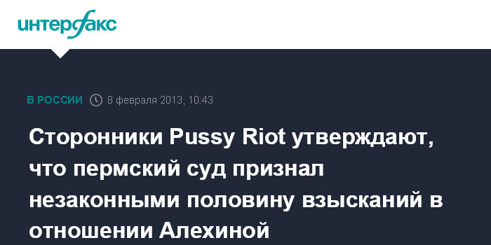 Пермь. 8 февраля. INTERFAX.RU - Суд в Пермском крае отменил два из четырех взысканий, наложенных в колонии на участницу Pussy Riot Марию Алехину, утверждают ее сторонники в "твиттере".