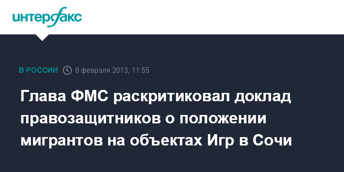 Москва. 8 февраля. INTERFAX.RU - Руководитель Федеральной миграционной службы (ФМС) России Константин Ромодановский опроверг данные правозащитной организации Human Rights Watch о нарушении прав иностранных трудовых мигрантов, которые работают на олимпийских объектах в Сочи.