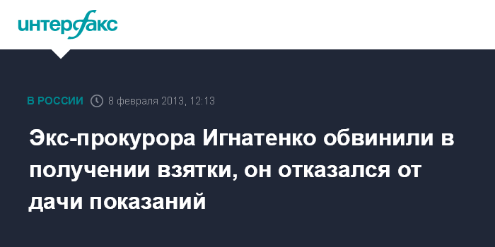 "Предъявлено обвинение по статье 290 ("Взятка") УК РФ. На наш взгляд, были допущены процессуальные нарушения, поэтому А.Игнатенко от дачи показаний отказался", - сказал "Интерфаксу" адвокат бывшего зампрокурора Александр Аснис.