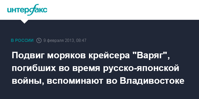 Владивосток. 9 февраля. ИНТЕРФАКС-ДАЛЬНИЙ ВОСТОК - Торжественные и памятные мероприятия проходят во Владивостоке в связи со 109-й годовщиной героического сражения бронепалубного крейсера "Варяг" и канонерской лодки "Кореец" с японской эскадрой в 1904 году.