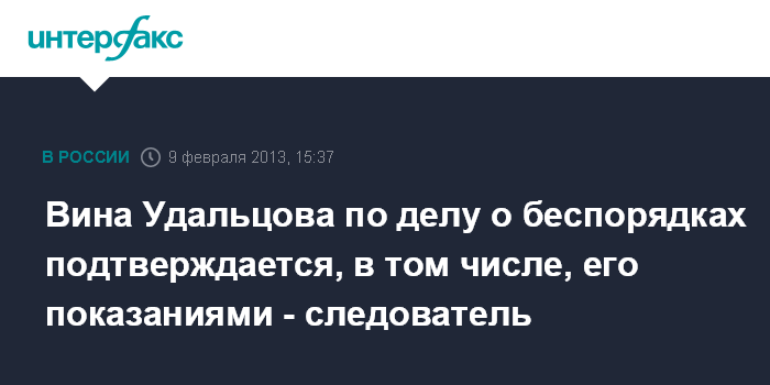 Москва. 9 февраля. INTERFAX.RU - Следствие считает, что координатор "Левого фронта" Сергей Удальцов своими показаниями подтвердил свою причастность к попытке организовать массовые беспорядки. "Вина С.Удальцова подтверждается показаниями свидетелей, показаниями самого С.Удальцова, видео и аудио материалами", - заявил следователь в ходе рассмотрения в субботу Басманным судом Москвы ходатайства о переводе С.Удальцова под домашний арест.