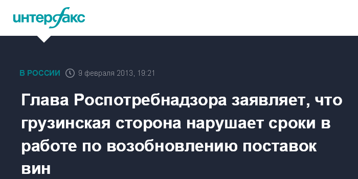 Владивосток. 9 февраля. ИНТЕРФАКС - Роспотребнадзор, несмотря на сроки, оговоренные в документе о возобновлении поставки грузинских вин и минеральной воды в Россию, до сих пор не получил ответ от грузинской стороны, сообщил главный государственный санитарный врач РФ Геннадий Онищенко в интервью в программе "Вести в субботу с Сергеем Брилевым", которая транслировалась на Дальний Восток.