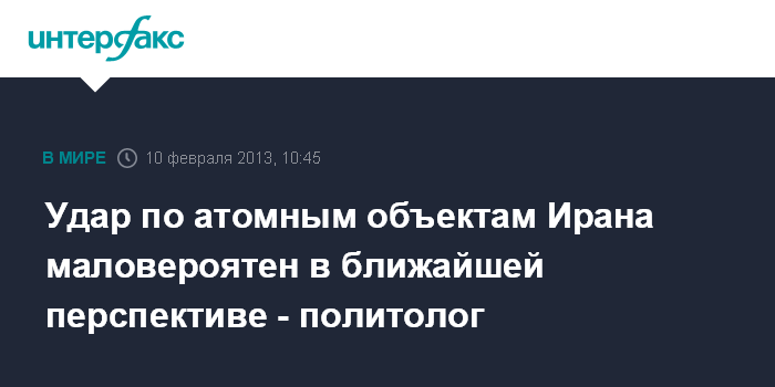 Москва. 10 февраля. INTERFAX.RU - США и Израиль вряд ли решатся нанести удар по иранским ядерным объектам в ближайшей перспективе, заявил "Интерфаксу-АВН" израильский политолог Владимир (Зеэв) Ханин.