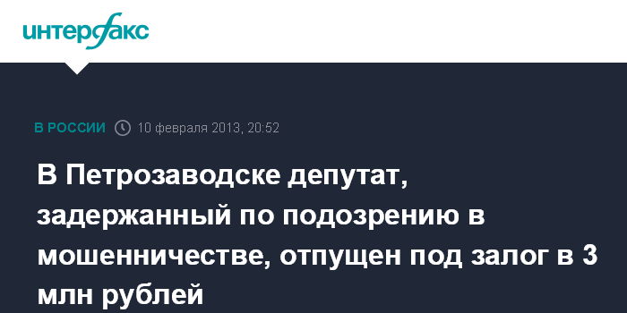 В Петрозаводске депутат, задержанный по подозрению в мошенничестве, отпущен под залог в 3 млн рублей