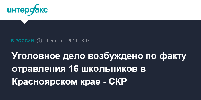 Красноярск. 11 февраля. ИНТЕРФАКС-СИБИРЬ - Следственное управление СК РФ по Красноярскому краю возбудило уголовное дело по факту отравления 16 школьников в поселке Тюхтет, которые накануне ели плов, сообщает пресс-служба ведомства.