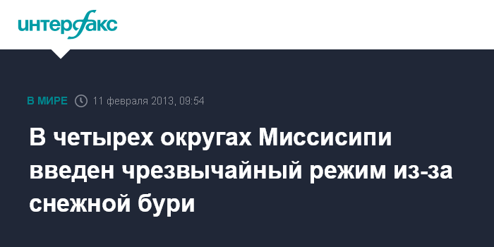 Вашингтон. 11 февраля. INTERFAX.RU - Губернатор американского штата Миссисипи Фил Брайант объявил о введении режима чрезвычайного положения в округах Форест, Ламар, Лоуренс и Мэрион, которые больше остальных пострадали от снежной бури, обрушившейся на северо-восточные штаты США.