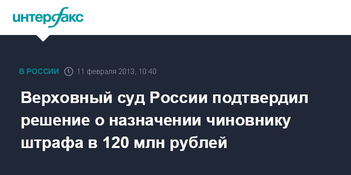 Верховный суд России подтвердил решение о назначении чиновнику штрафа в 120 млн рублей