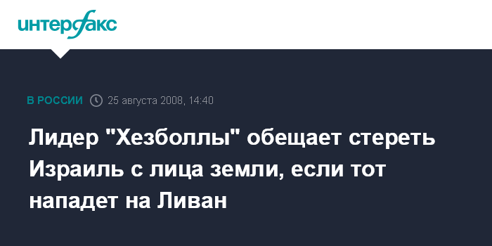 Бейрут. 25 августа. INTERFAX.RU - Лидер ливанского шиитского движения "Хезболла" Хасан Насралла поклялся стереть Израиль с лица земли, если войска этой страны нападут на Ливан.