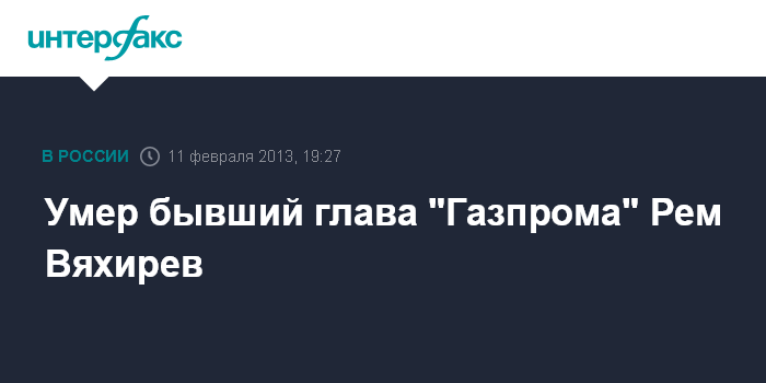 Москва. 11 февраля. INTERFAX.RU - Экс-глава "Газпрома" Рем Вяхирев умер в понедельник около 17-00 МСК, сообщил Агентству газовой информации источник в газовой отрасли.