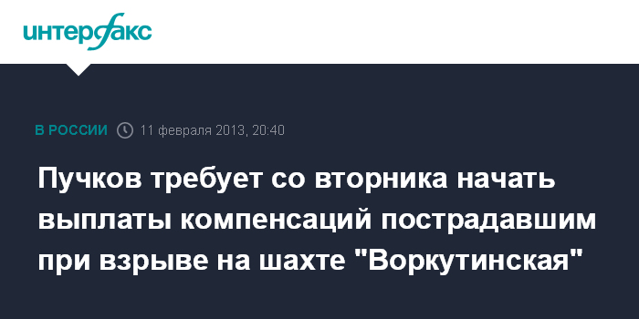 Шахта Воркутинская (Коми). 11 февраля. INTERFAX.RU - Глава МЧС Владимир Пучков потребовал уже в ближайшее время - с утра вторникак - приступить к выплатам компенсаций пострадавшим и семьям погибших при взрыве метана на шахте "Воркутинская".