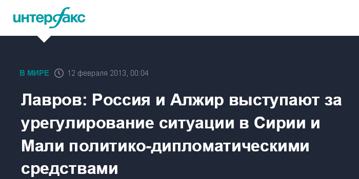 Алжир. 12 февраля. ИНТЕРФАКС - Россия и Алжир едины в том, что в ситуации в Сирии и Мали должны быть урегулированы дипломатическим способом без всякого вмешательства извне.