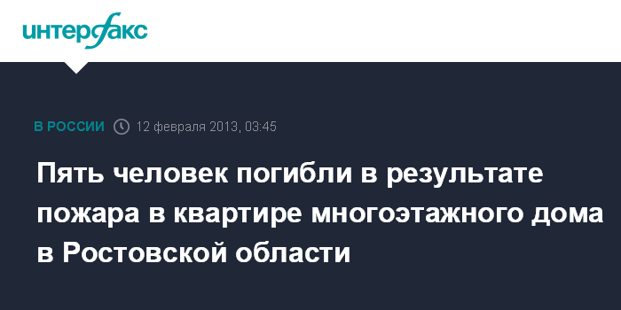 "Возгорание квартиры на шестом этаже девятиэтажного жилого дома произошло вечером в понедельник. В результате пожара в квартире было обнаружено тело 1961 г.р. Кроме того, в больницу были доставлены мужчина 1957 г.р. и трое детей (2000, 2008 и 2012 г.р.), которые скончались в реанимации", - сказал собеседник агентства.