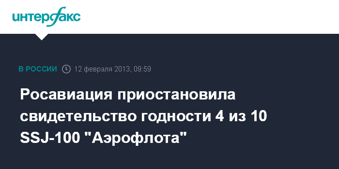 Москва. 12 февраля. INTERFAX.RU - ОАО "Аэрофлот" получило от Росавиации письмо о приостановке свидетельства годности четырех из 10 самолетов SSJ-100, сообщили "Ведомости" со ссылкой на два источника, близких к ведомству.