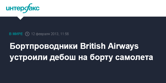Москва. 12 февраля. INTERFAX.RU - Бортпроводники авиакомпании British Airways устроили пьяный дебош на борту самолета, летевшего из Лондона в Вашингтон, пишет британская газета Daily Mail.