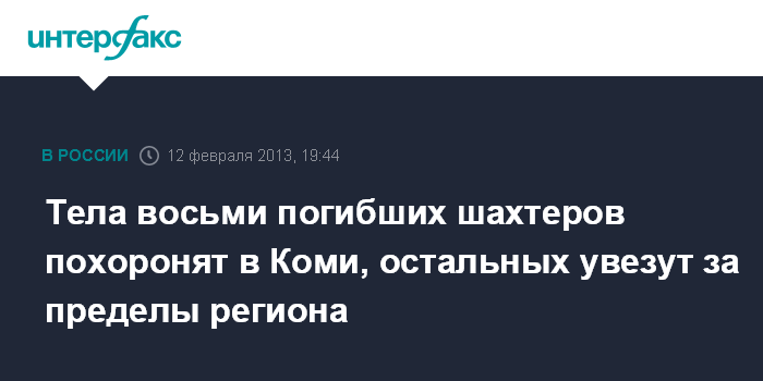 Сыктывкар. 12 февраля. INTERFAX.RU - Тела 8 погибших при аварии на воркутинской шахте похоронят в Коми, остальных увезут за пределы региона и России, сообщает во вторник пресс-служба регионального МЧС.