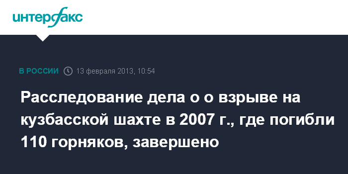 Расследование дела о о взрыве на кузбасской шахте в 2007 г., где погибли 110 горняков, завершено