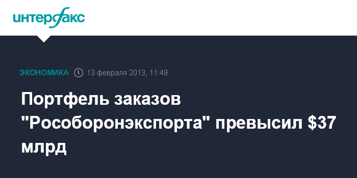 Москва. 13 февраля. INTERFAX.RU - "Рособоронэкспорт" сформировал портфель заказов на поставку вооружений и военной техники объемом более $37 миллиарда.