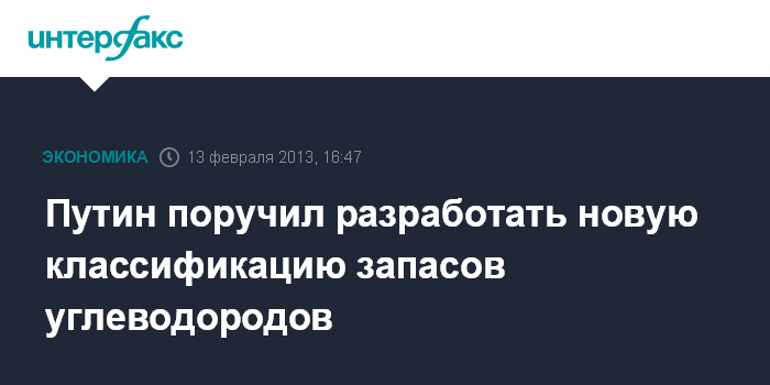 Москва. 13 февраля. INTERFAX.RU - Президент РФ Владимир Путин на заседании комиссии по топливно-энергетическому комплексу поручил разработать новую классификацию запасов углеводородов, приближенную к западной.