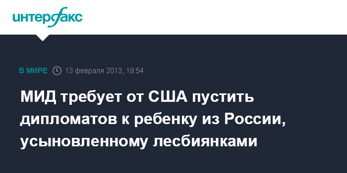 "Очередной "аморальный фокус" американцев: две лесбиянки из США в 2007 г. обманули суд РФ для того, чтобы усыновить российского ребенка", - написал уполномоченный МИД РФ по вопросам прав человека, демократии и верховенства права Константин Долгов в среду в своем микроблоге в Твиттере.