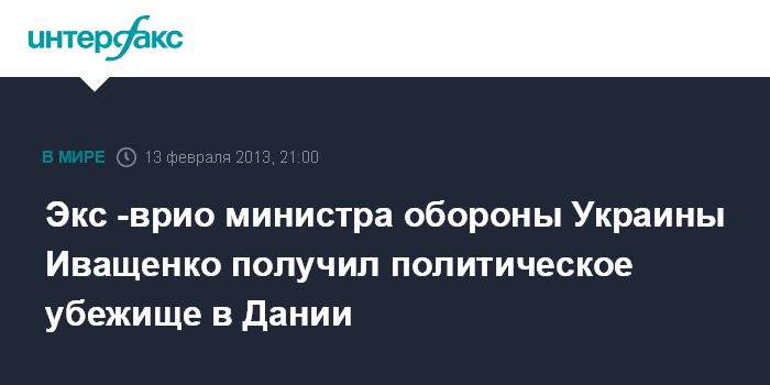 Киев. 13 февраля. INTERFAX.RU - Бывший вр.и.о. министра обороны Украины Валерий Иващенко получил политическое убежище в Дании, сообщает в среду украинское издание Тиждень.ua.