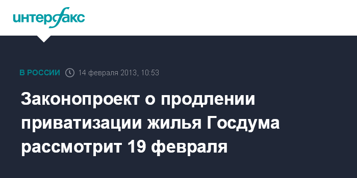 Москва. 14 февраля. INTERFAX.RU - Законопроект о продлении бесплатной приватизации жилья до 1 марта 2015 г. Дума рассмотрит 19 февраля, сообщил журналистам спикер нижней палаты парламента Сергей Нарышкин в четверг по итогам заседания совета Думы.