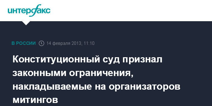 Санкт-Петербург. 14 февраля. INTERFAX.RU - Конституционный суд России не считает, что ограничения, накладываемые на организаторов публичных акций, привлекавшихся к административной ответственности, нарушают права граждан.