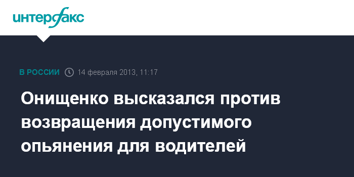 Москва. 14 февраля. INTERFAX.RU - Руководитель Роспотребнадзора, главный государственный санитарный врач РФ Геннадий Онищенко выступил против инициативы отменить так называемое "нулевое промилле" для автомобилистов.